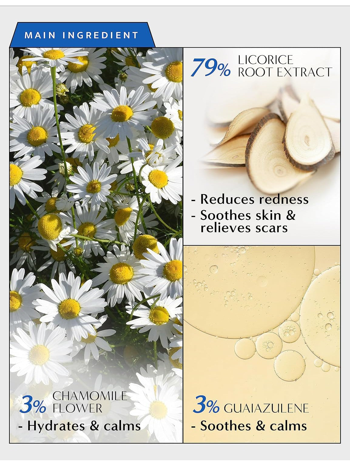 • NO MORE REDNESS AND SCARS: This facial essence is enriched with Guaiazulene and Camomile flower extract. This active ingredient in our facial essence accelerates the restorative process of burns while soothing and hydrating sensitive and flushed skin.