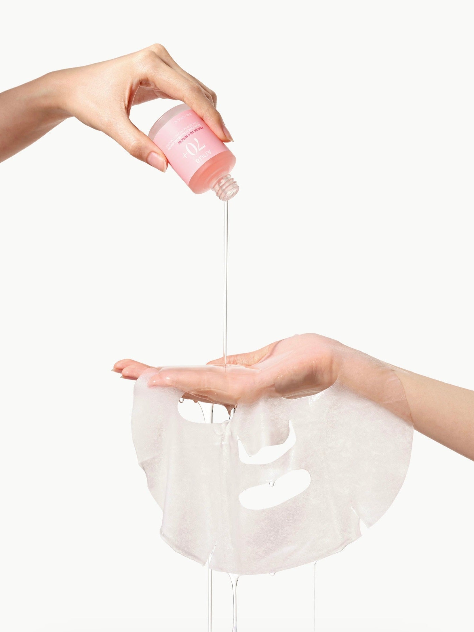 A sheet mask containing all the active ingredients of a full bottle of Anua Peach 70 Niacin Serum that creates a moisturized glow in the skin’s complexion.