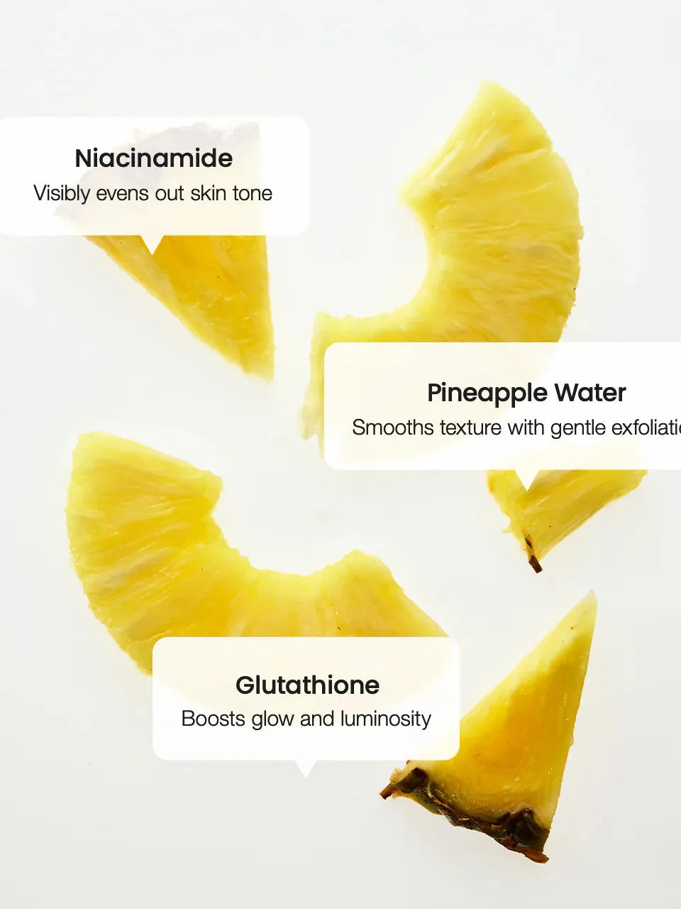Ananas Sativus (Pineapple) Fruit Water, Niacinamide, Glycerin, Butylene Glycol, Water(Aqua), 1,2-Hexanediol, Propanediol, Diethoxyethyl Succinate, Methyl Gluceth-20, Pentylene Glycol, Polyglycerin-3, Carbomer, Arginine, Coptis Japonica Root Extract, Ethylhexylglycerin, Xanthan Gum, Disodium EDTA, Glyceryl Acrylate/Acrylic Acid Copolymer, Glutathione, Biosaccharide Gum-1, PVM/MA Copolymer, Tocopherol