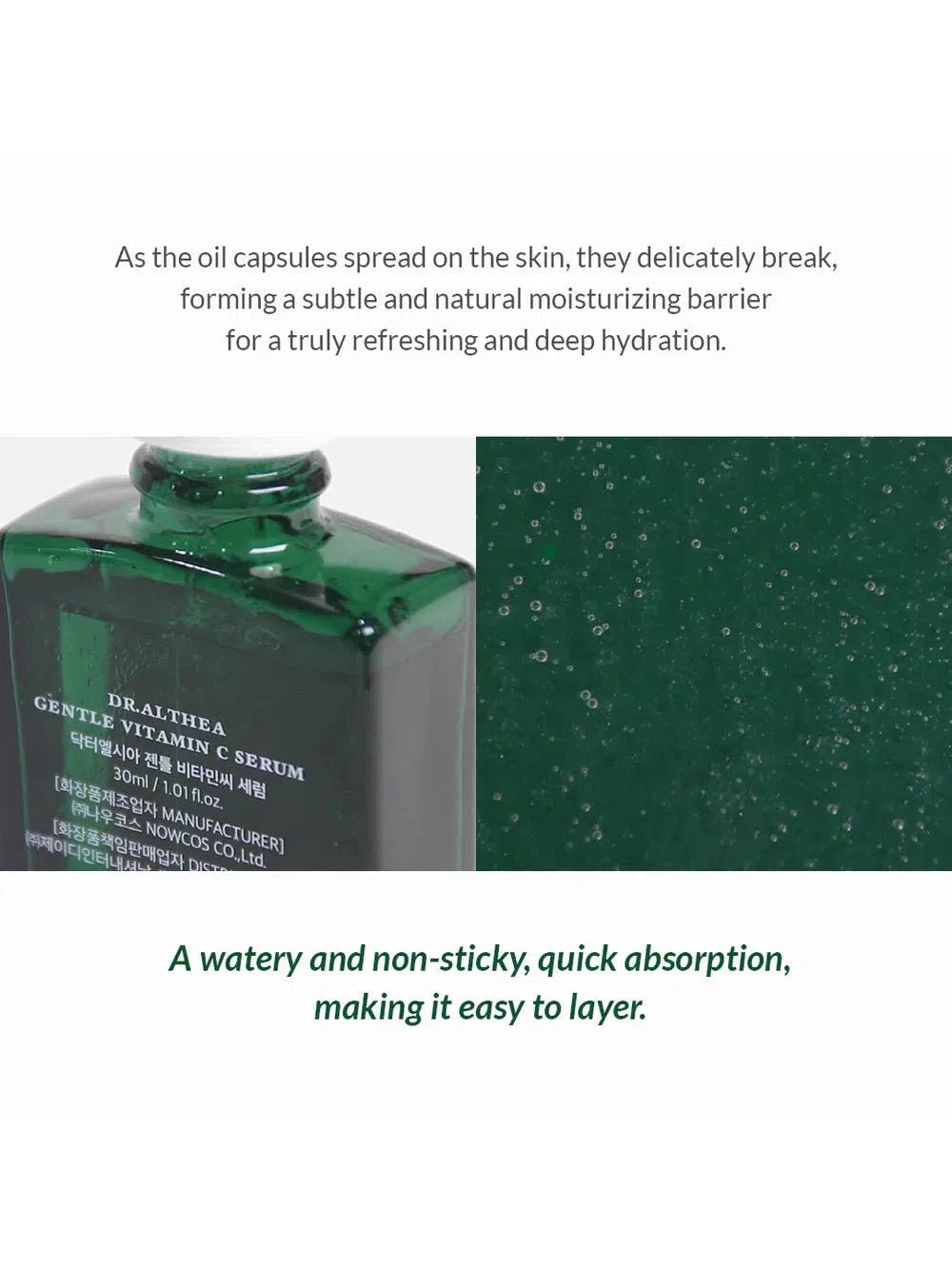Gentle Vitamin C is a beginner friendly serum designed to combat dark spots and improve skin tone. Formulated with Niacinamide, 3-0-ethyl ascorbic acid, and Hippophae rhamnoides fruit extract, it surpasses vitamin C levels found in various fruits. Tailored for sensitive skin, the serum's minimalistic composition of under 20 ingredients is acne-safe and enriched with Camellia sinensis leaf water for soothing effects. Its innovative oil capsule system provides a watery, non-sticky texture, delivering deep hydration and addressing elasticity, firmness, and anti-aging concerns through Allantoin and Adenosine.