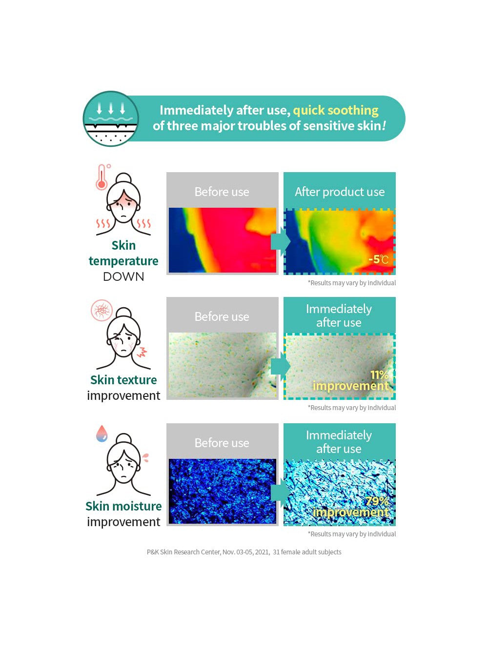 - QUICK IMPROVEMENT IN MAJOR CONCERNS OF SENSITIVE SKIN: After one use, it shows 90% improvement of temporary redness. Also, it reduces the skin temperature and improves the skin texture and moisture.