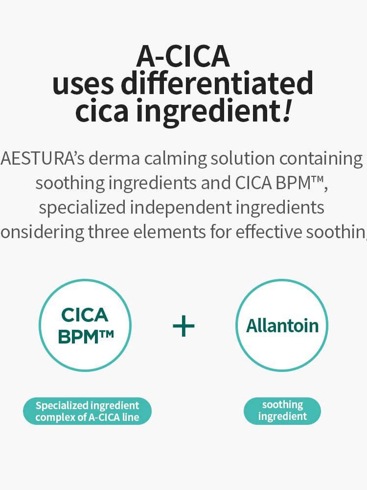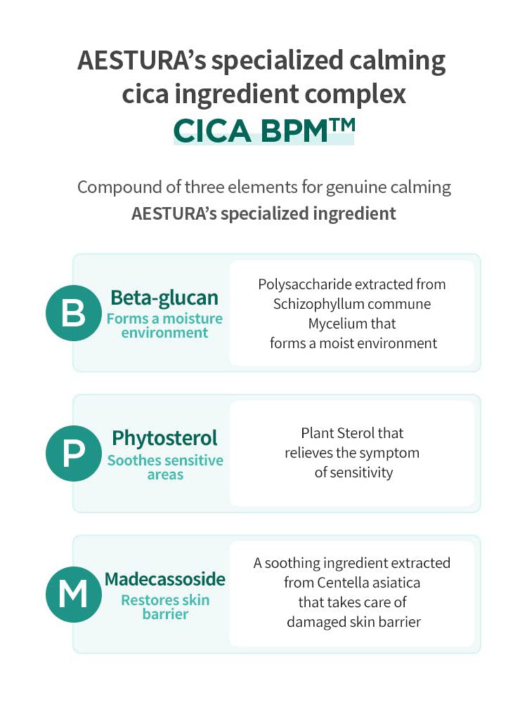 - A-CICA USES DIFFERENTIATED CICA INGREDIENTS: AESTURA's proprietary Cica ingredient complex, CICA BPM, is a compound of three elements (Beta-glucan, Phytosterol, Madecassoside) for genuine calming, effective soothing and skin barrier restoration.