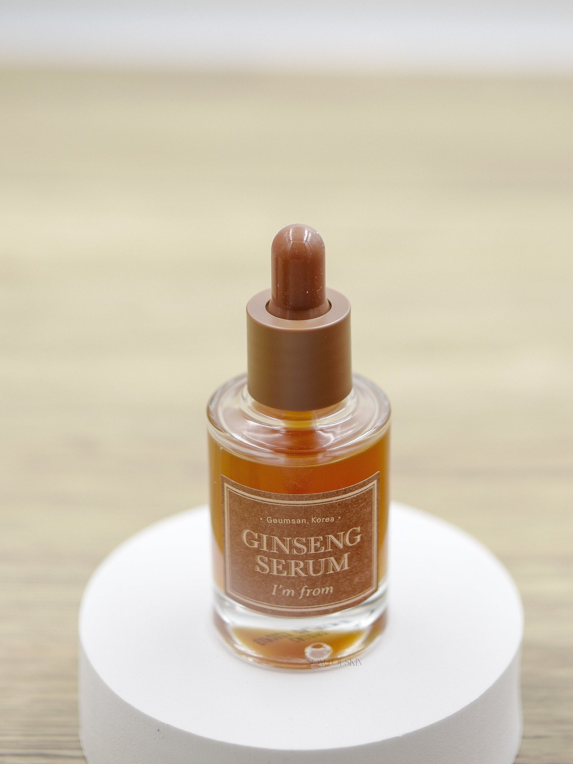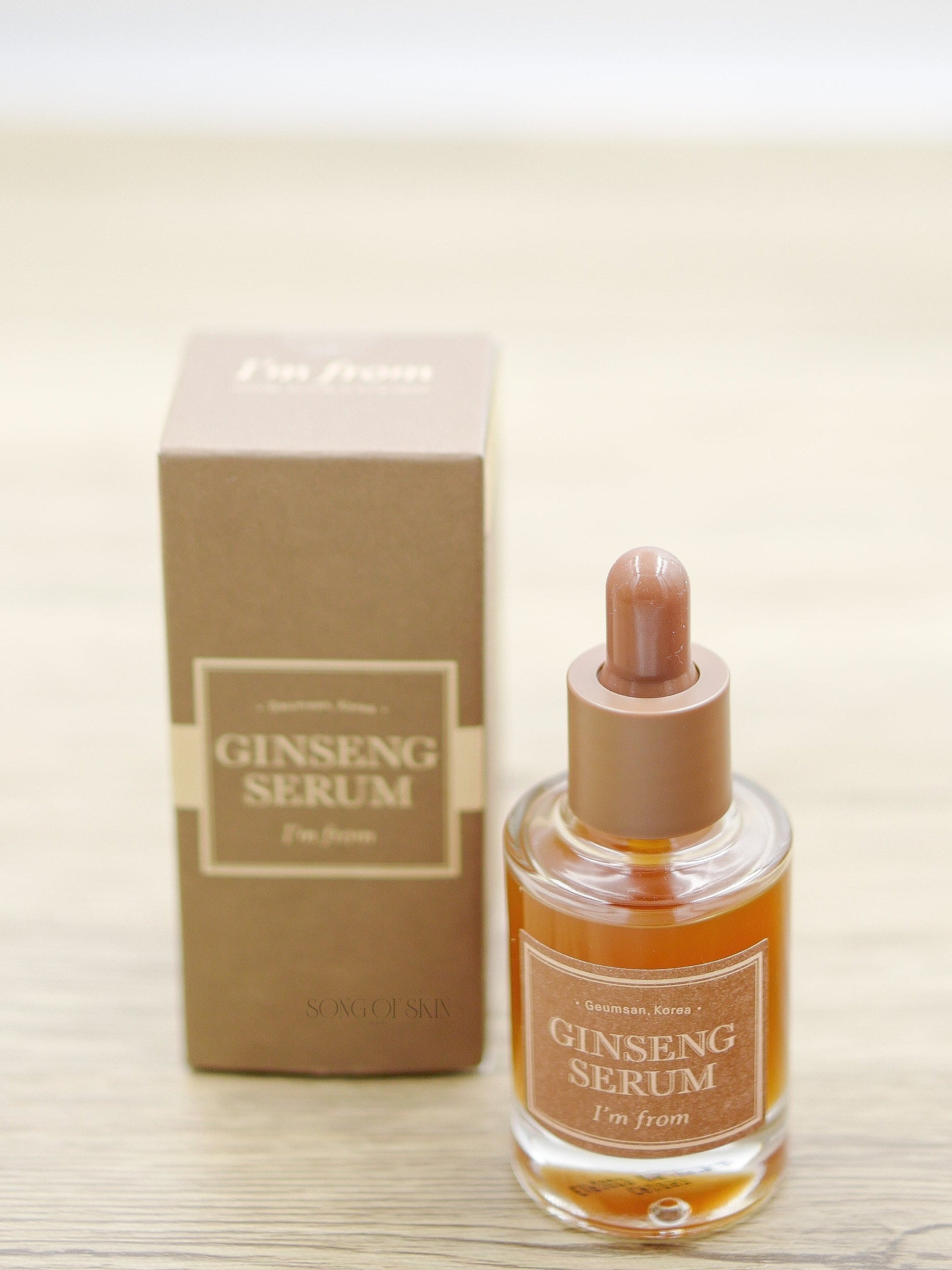 I'm From Ginseng Serum! This serum is infused with red ginseng sap, which enhances blood circulation and helps reduce fine lines and wrinkles. Plus, it's packed with antioxidants that help purify your skin and protect it from future damage.