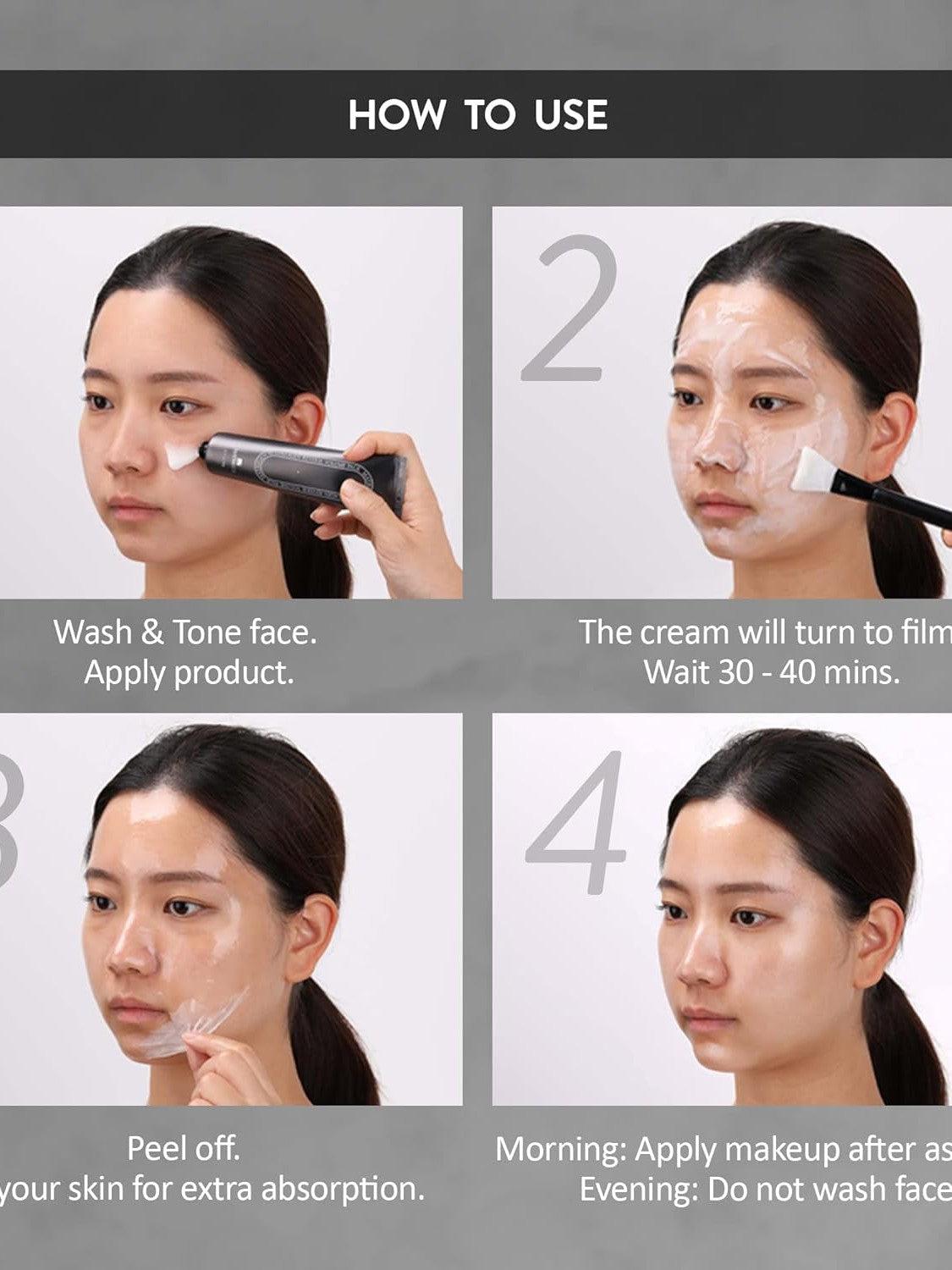 Using a face brush, mask applicator or your fingers, apply an even layer of the product on the face, avoiding eyebrows, hairline, eye area, and lips. Wait 30-40 minutes for the reverse film to make well. Once the time is up, from the top gently peel off, starting on the outside edges to reveal an instant facelift. Just leave on any remaining residue to make up or sleep as usual.